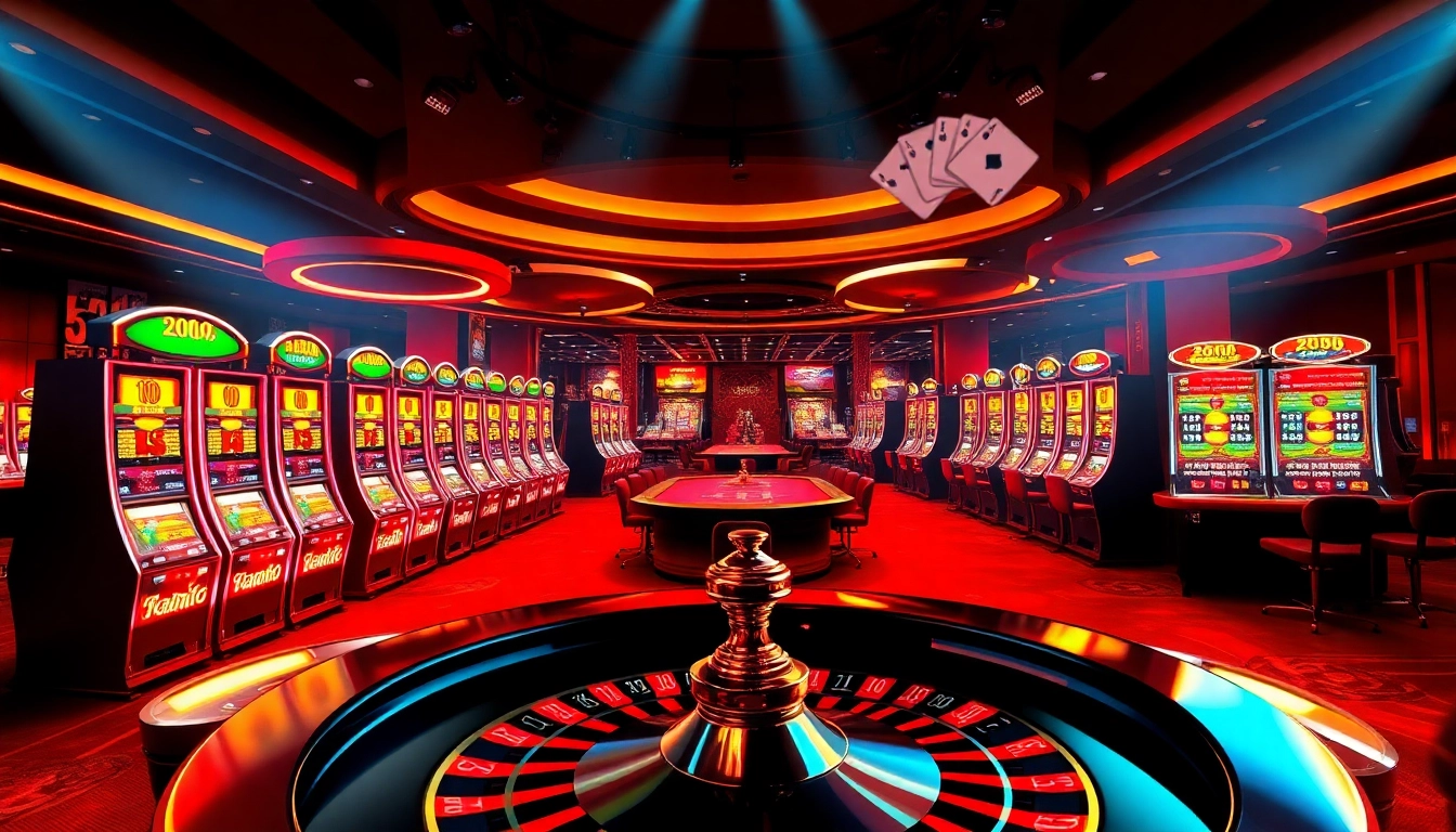 Experience the excitement of gambling on Trang Chá»§ FB88 with vibrant casino visuals showcasing tables and slot machines.